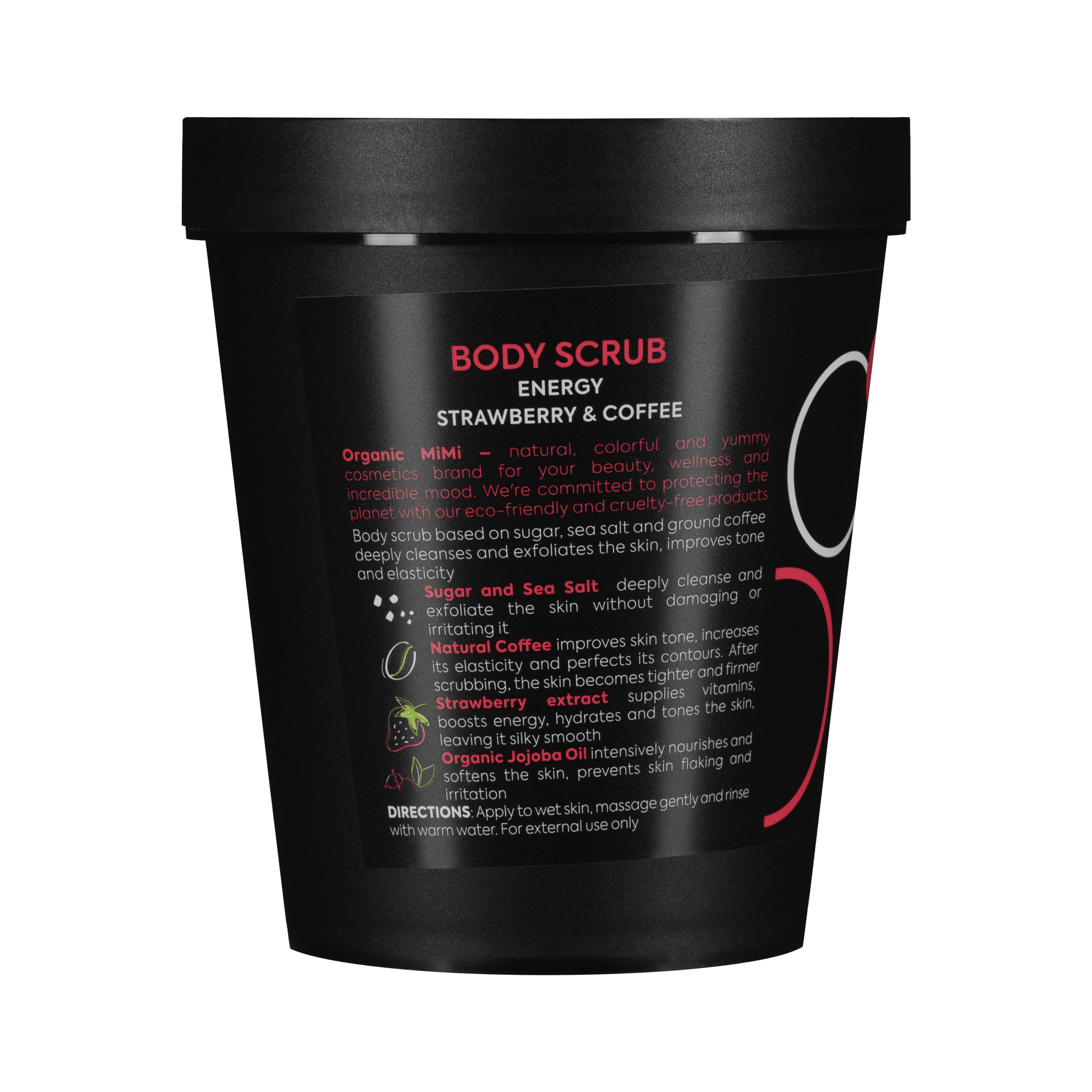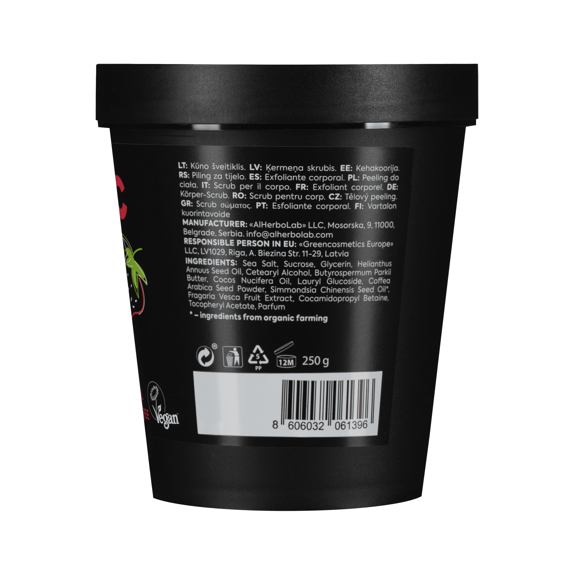 Body scrub based on sugar, sea salt and ground coffee deeply cleanses and exfoliates the skin, improves tone and elasticity
