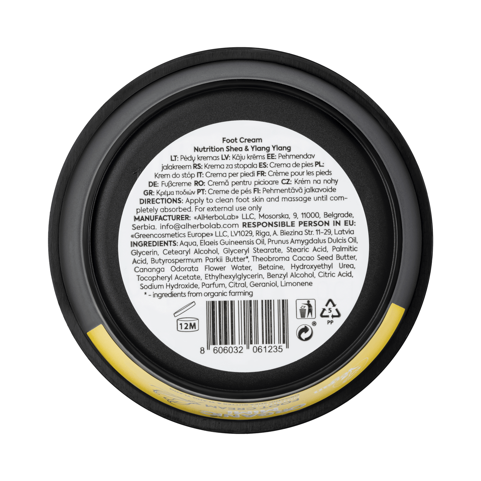 Foot cream based on Organic Shea Butter, Cocoa Butter and Ylang Ylang Hydrolat deeply nourishes, softens and moisturizes the skin, fights the problem of chapped feet. It is quickly absorbed and provides intensive care and comfort