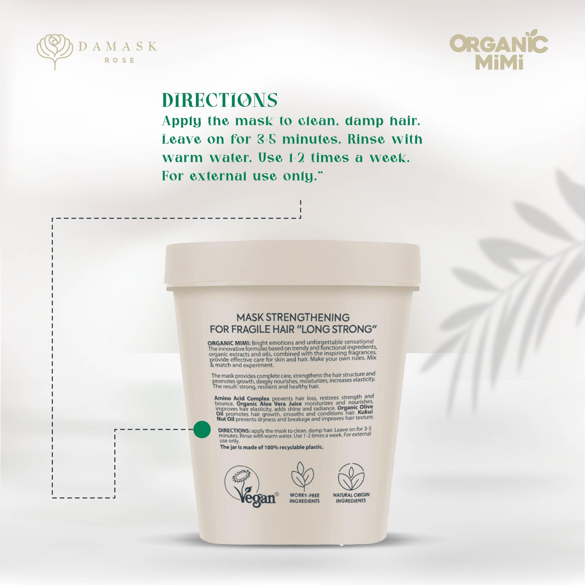 DIRECTIONS: Apply the mask to clean, damp hair. Leave on for 3-5 minutes. Rinse with warm water. Use 1-2 times a week. For external use only.
