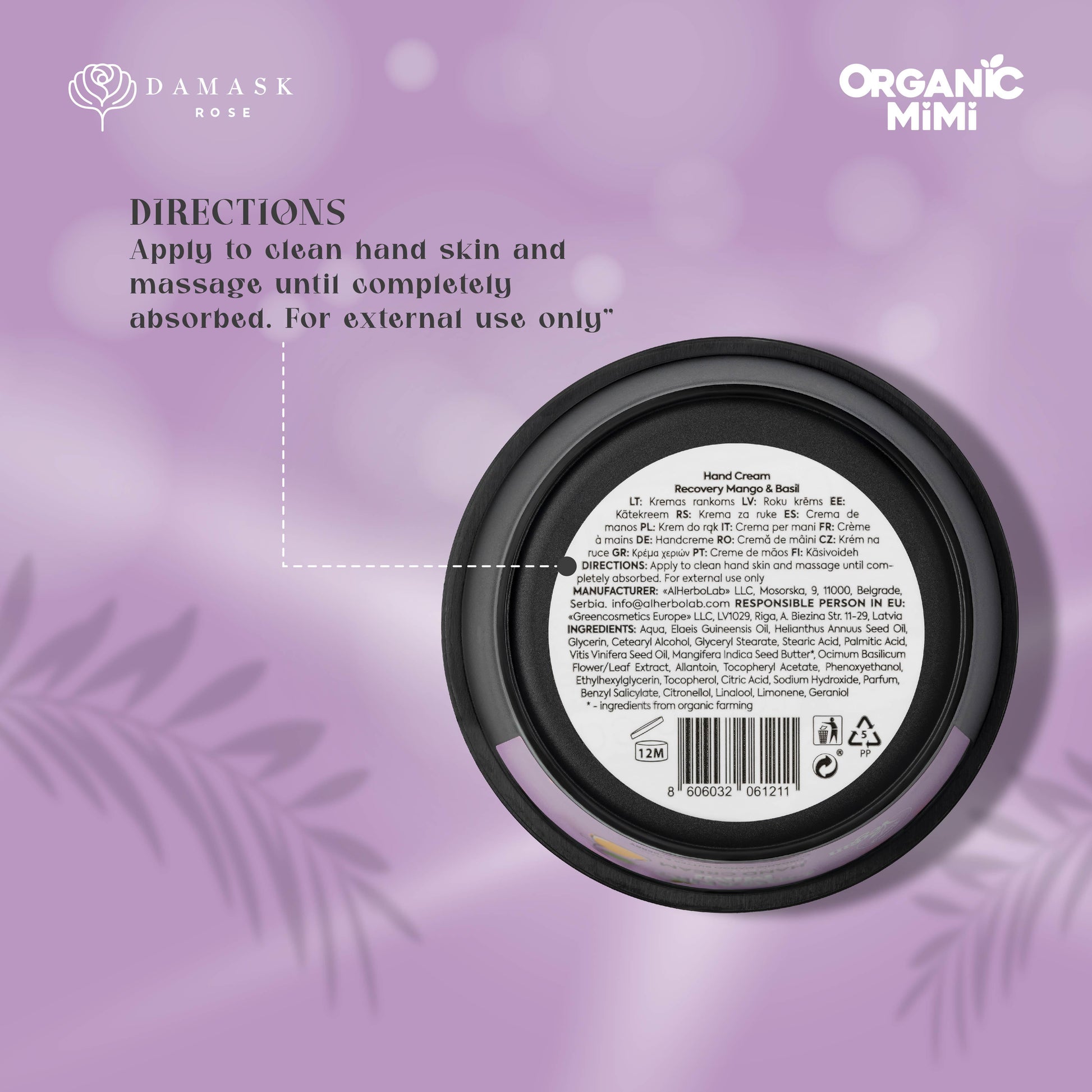Hand cream with Organic Mango Oil, Grape Seed Oil and Basil Extract promotes rapid recovery, protects the skin, moisturizes and softens, leaving the skin smooth and silky smooth